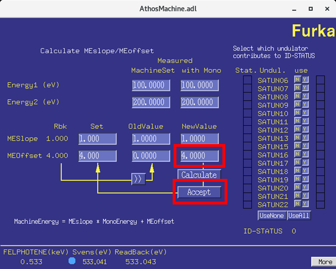 Change the "offset" number. This number should be difference between the "machine energy" and "photon energy" (e.g. 533 eV - 529 eV = + 4 eV) (as shown in the calculation). Change the number under "new value", click "accept". The number on the left of the panel should update to the new number.